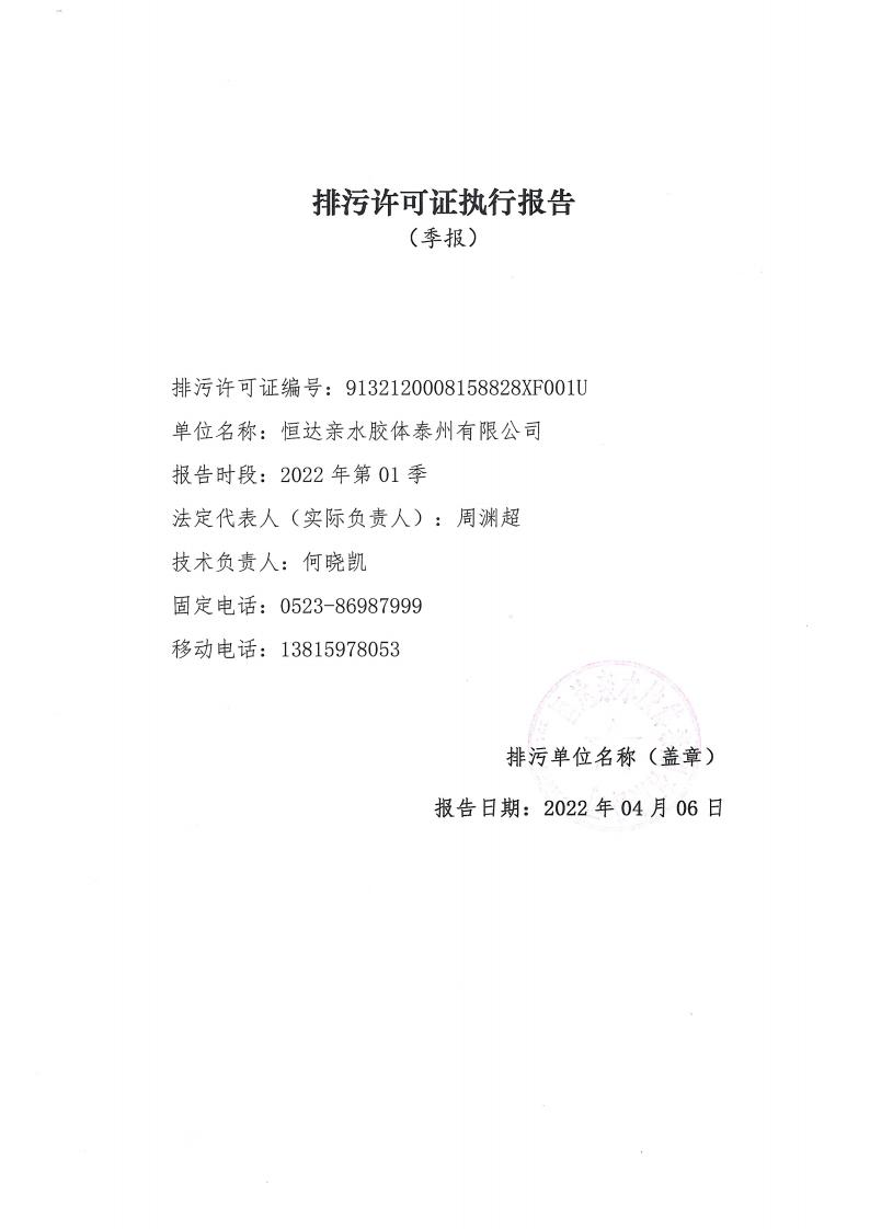 恒達(dá)親水膠體泰州有限公司-2022年第一季度排污許可證執(zhí)行報告