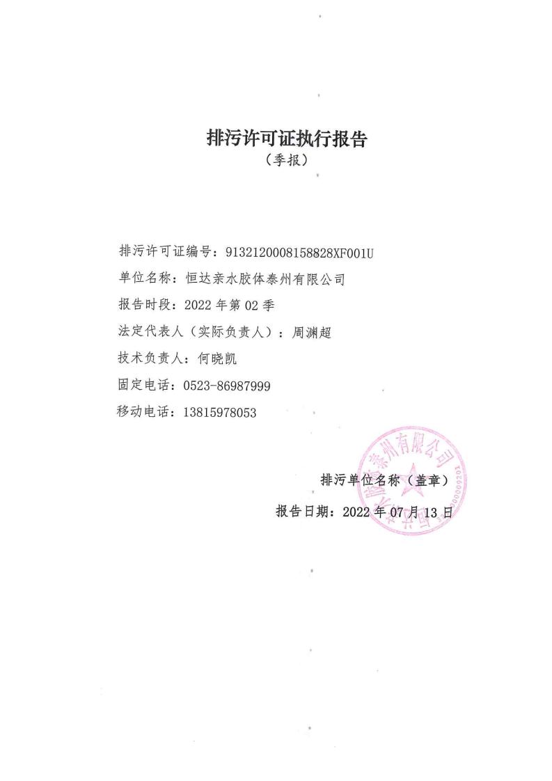 恒達(dá)親水膠體泰州有限公司-2022年第二季度排污許可證執(zhí)行報告