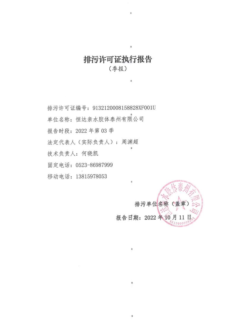 恒達(dá)親水膠體泰州有限公司-2022年第三季度排污許可證執(zhí)行報告