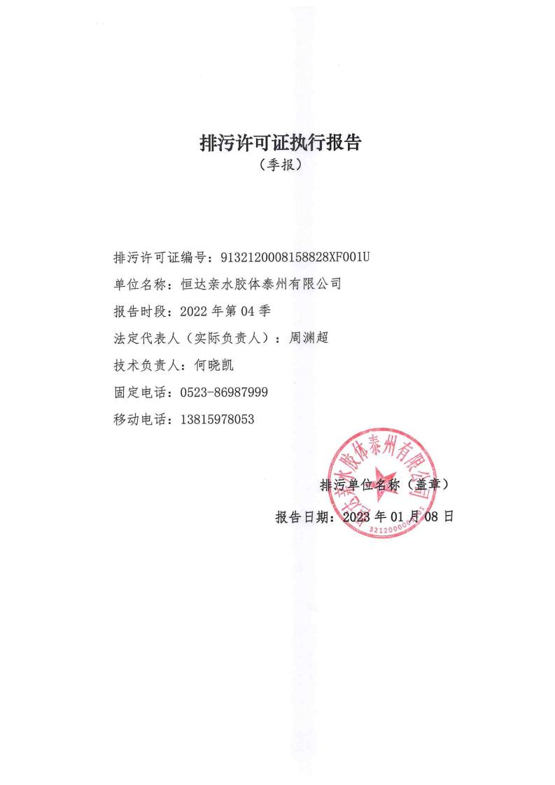 恒達(dá)親水膠體泰州有限公司-2022年第四季度排污許可證執(zhí)行報告