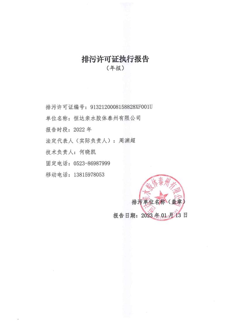 恒達(dá)親水膠體泰州有限公司-2022年年度排污許可證執(zhí)行報告